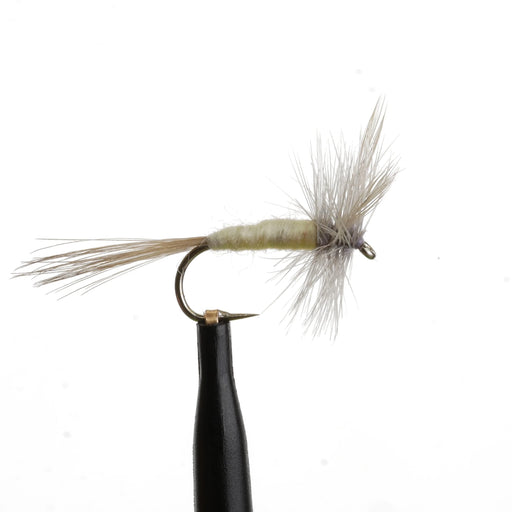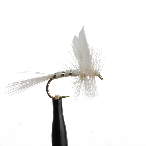 The White Miller is a versatile dry for imitating white-bodied mayflies or caddis. Its pale wings stand out in shaded runs or evening light.