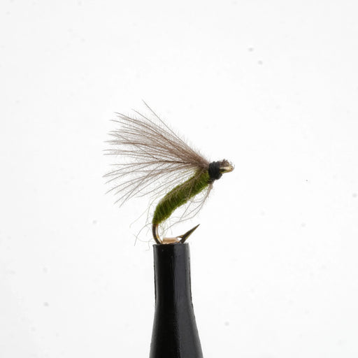 The Parachute Olive Caddis is a low-riding dry for imitating caddis on calm pools. Its parachute post makes it visible without spooking fish.